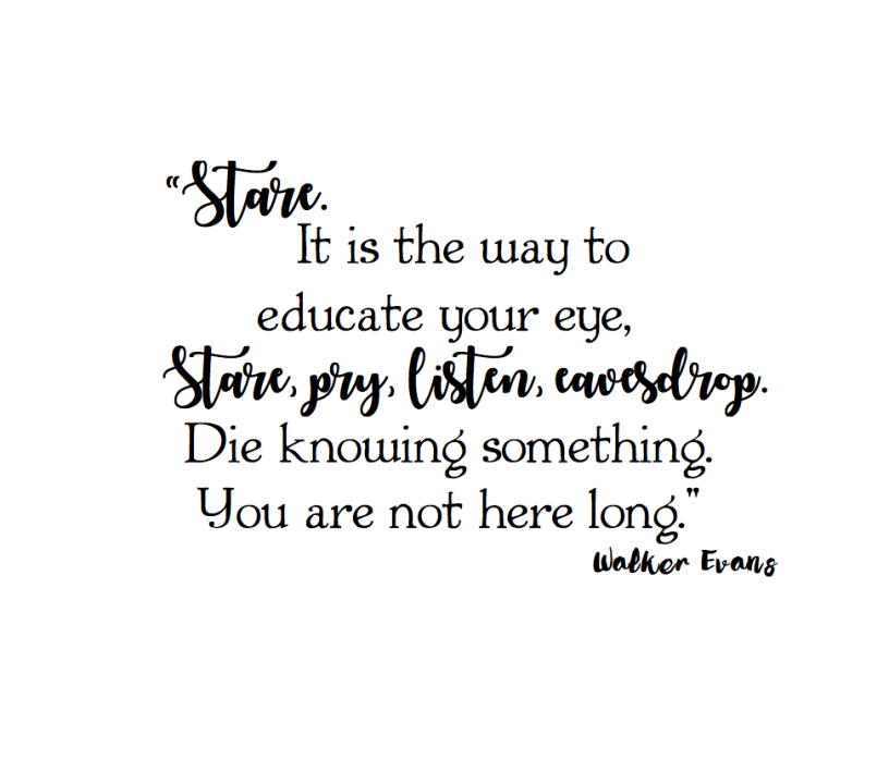 The quote reminds me to be aware always and that writing is pulled from the observation of reality. It’s also a bit of a free pass to eavesdrop in the name of art, but I think it’a necessary.